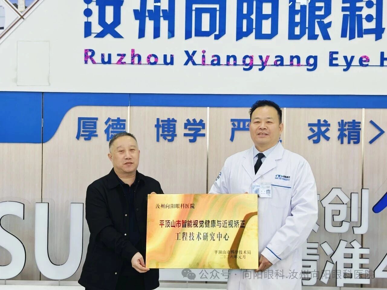 2月5日,春意初绽,喜讯临门。汝州向阳眼科医院东院区一楼门诊大厅内气氛庄重而热烈,“河南省科技型企业”与“平顶山市智能视觉健康与近视矫正工程技术研究中心”两项荣誉的授牌仪式在此隆重举行。汝州市科技局樊志涛局长一行亲临现场指导,并为医院授牌。韩向阳院长代表医院郑重接过了这两块沉甸甸的牌匾,标志着医院在科技创新与专科建设的道路上迈上了全新的台阶。